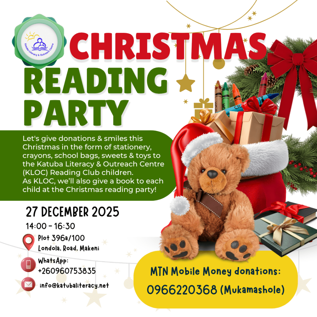 The Katuba Literacy and Outreach Centre Reading Club (KLOC Reading Club) currently runs reading and educational sessions for children in Makeni, Lusaka, twice a week during school holidays and once a week during the school term.