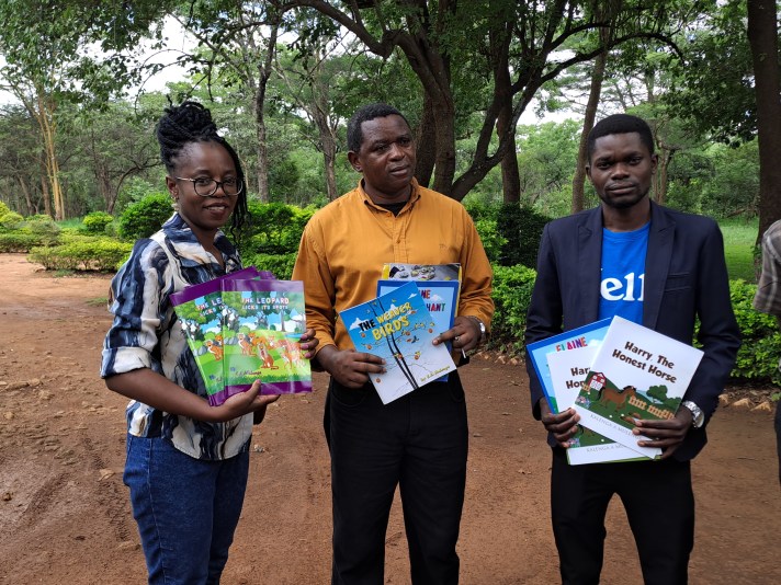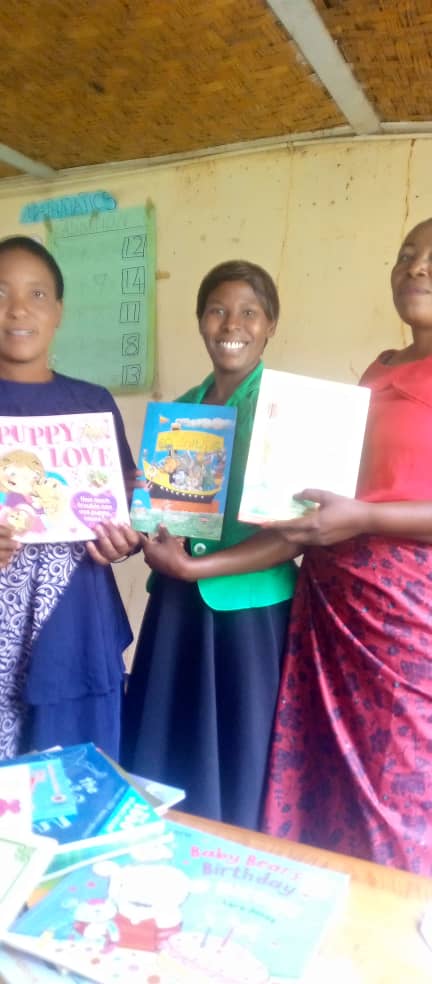 2023 Nov 28 – Teachers holding up some of the books gifted to Coffee Pre-School in Mpongwe, Copperbelt Province