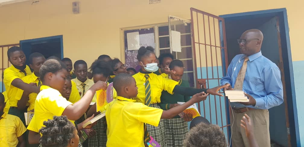 Jun 2023 – Board member of The Bridge Christian School, Mpongwe, giving a talk to learners with the books gifted to the school