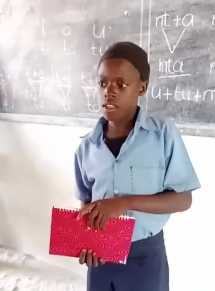 Jun 2023 – Pupil at The Bridge Christian School, Mpongwe, giving a vote of thanks for books received