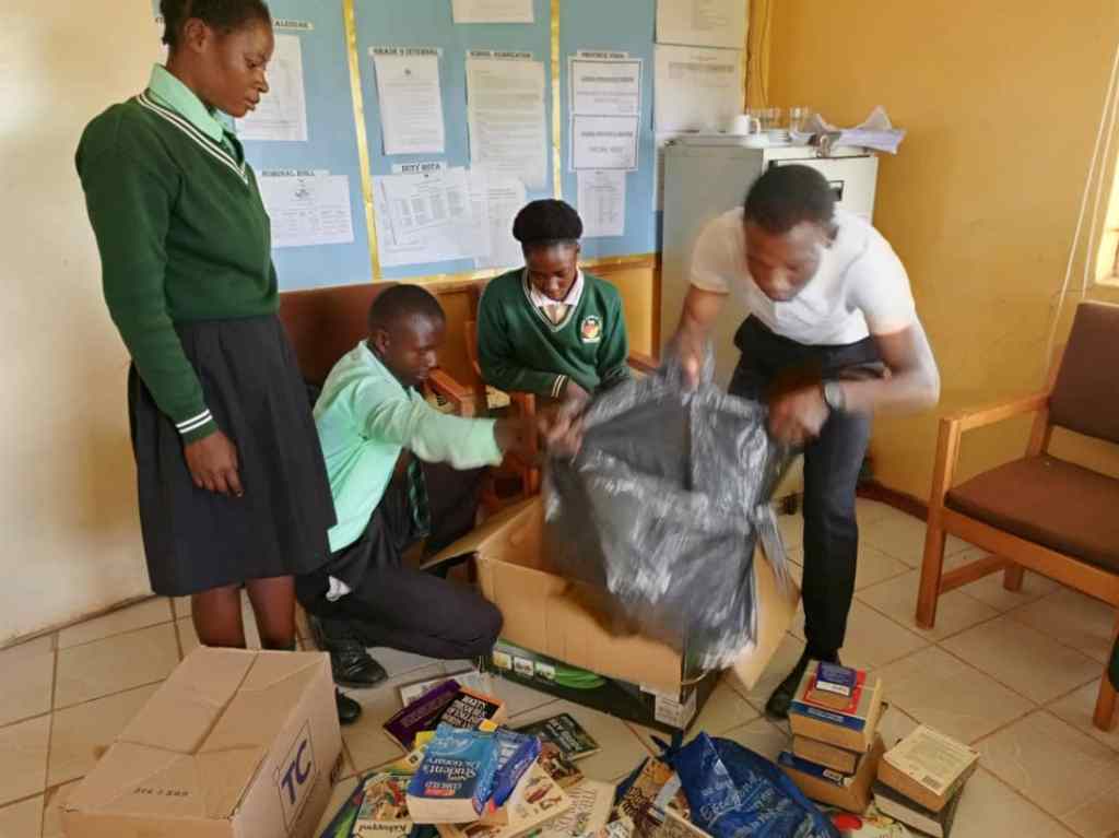 2023 Dec 1 – Learners open the boxes of books donated to Mikango Secondary School
